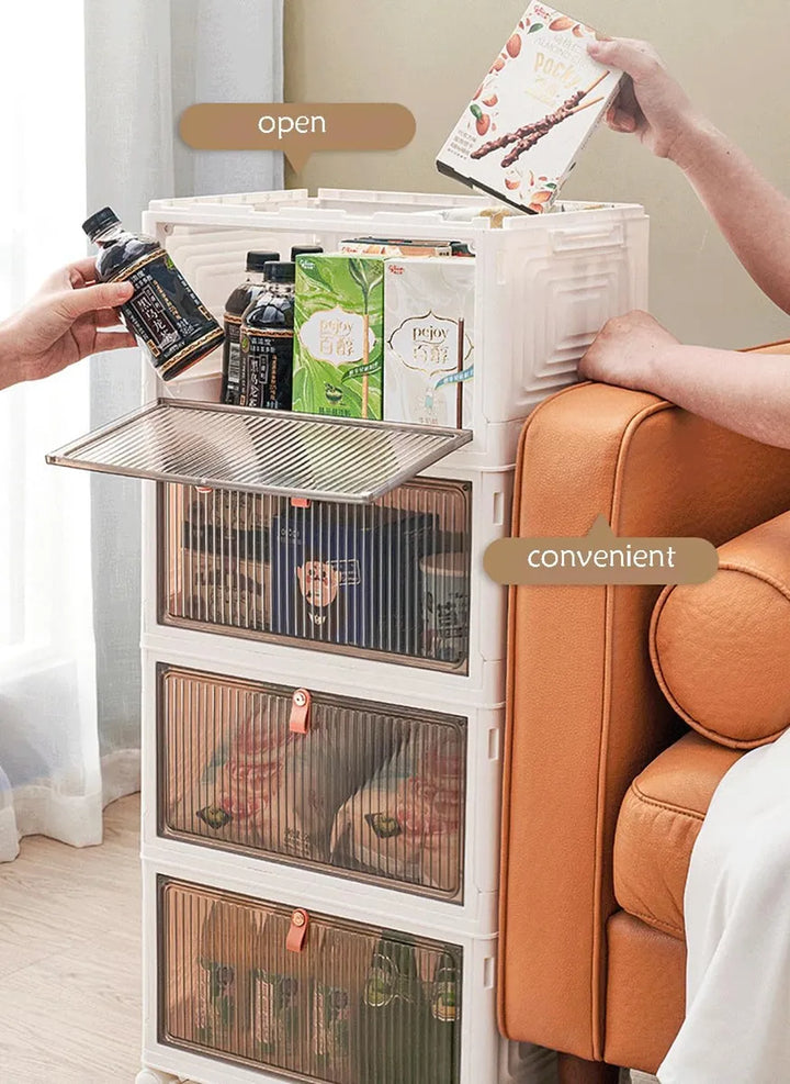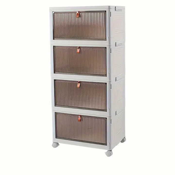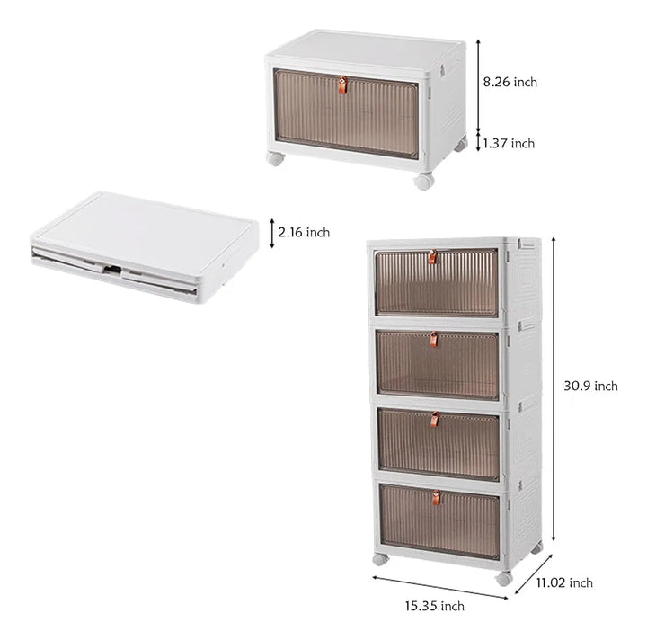 Organiza cada rincón de tu hogar con este versátil organizador de 4 cajones con puertas. Su diseño plegable se adapta a tus necesidades, permitiéndote ajustar los niveles según el espacio disponible. La tapa protectora mantiene tus pertenencias seguras del polvo, mientras que las ruedas facilitan su desplazamiento de la cocina al baño o la habitación. Perfecto para maximizar el almacenamiento sin sacrificar estilo ni funcionalidad.